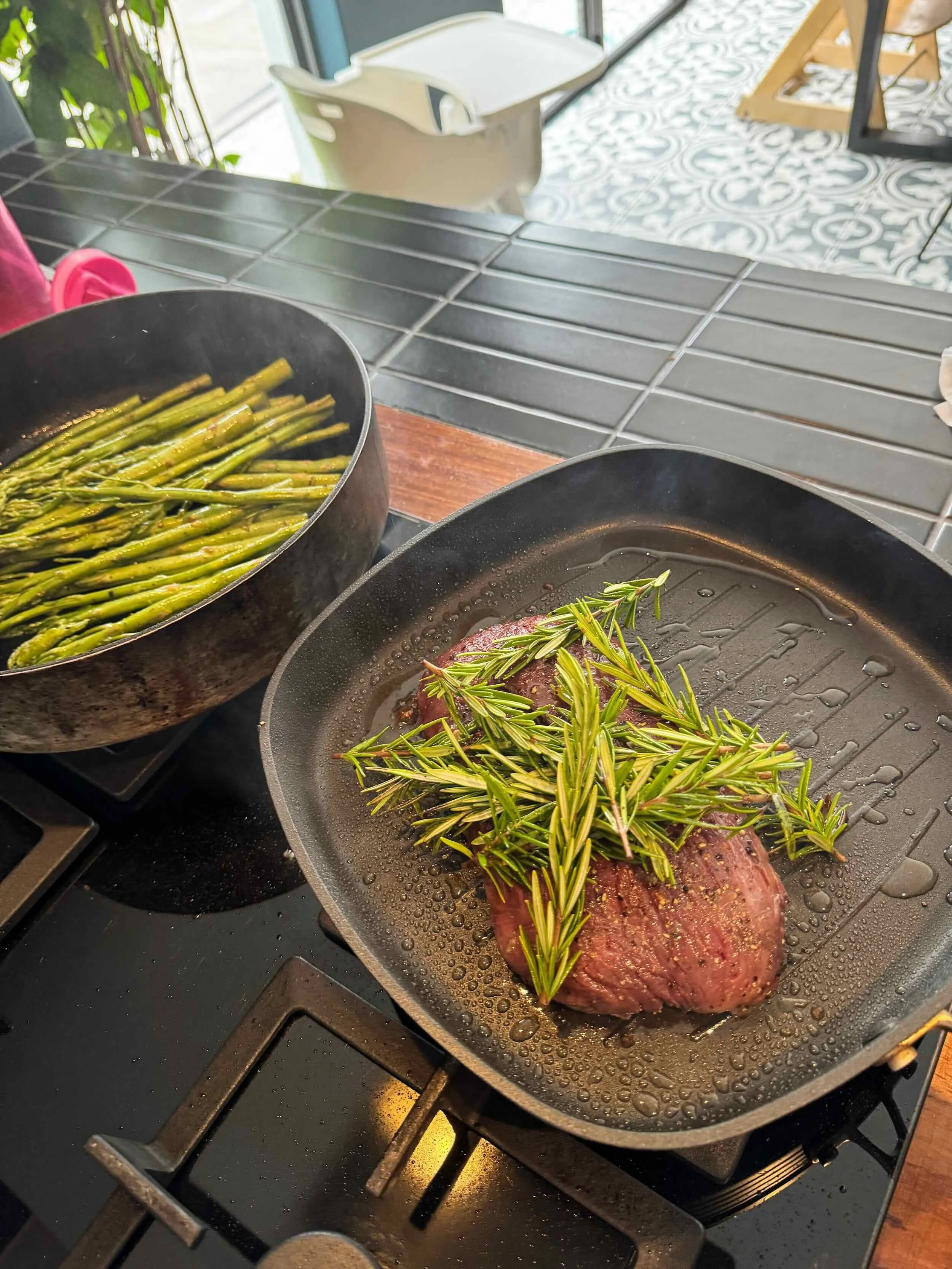 Ostrich pairs very well with some rosemary, and by scooping butter over it repeatedly, the flavour is enhanced. As a side,e I pan-fried some asparagus for this recipe, which is delicious topped with pine nuts for some crunch. A simple salad for freshness finishes the meal.