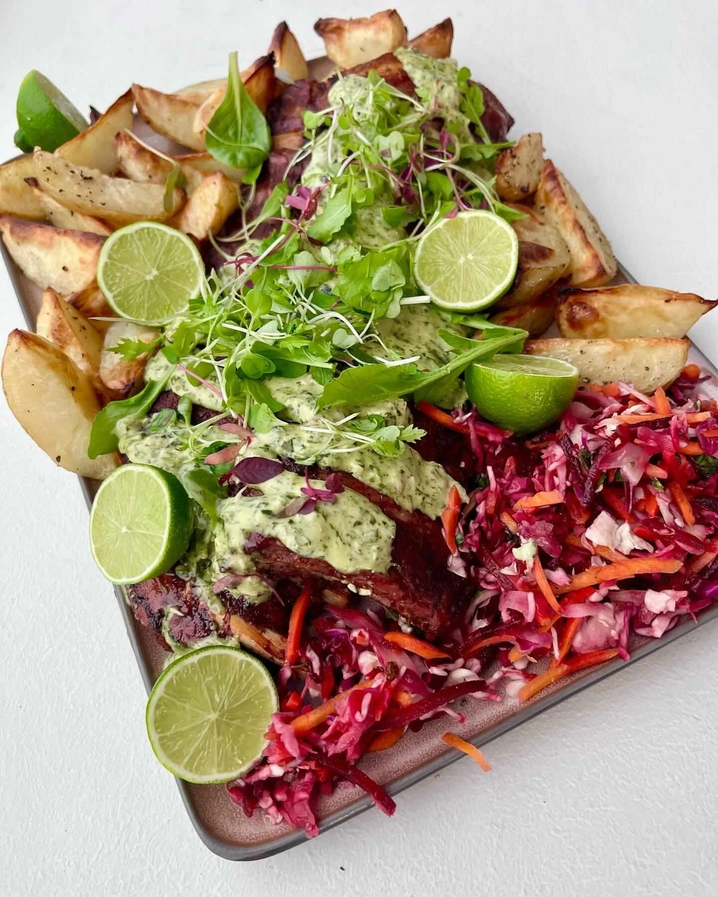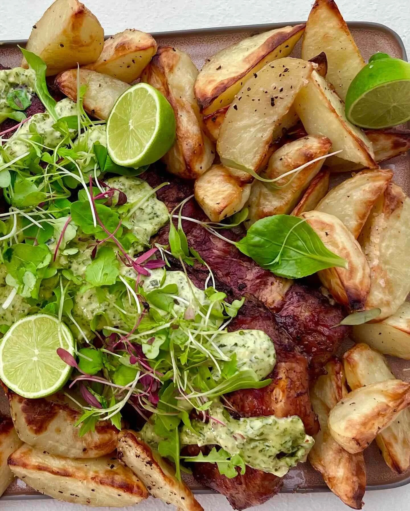 Mix the pesto and mayonnaise for a delicious dressing and serve with some potato wedges and salad, as well as cut up limes to squeeze over for some acidity.