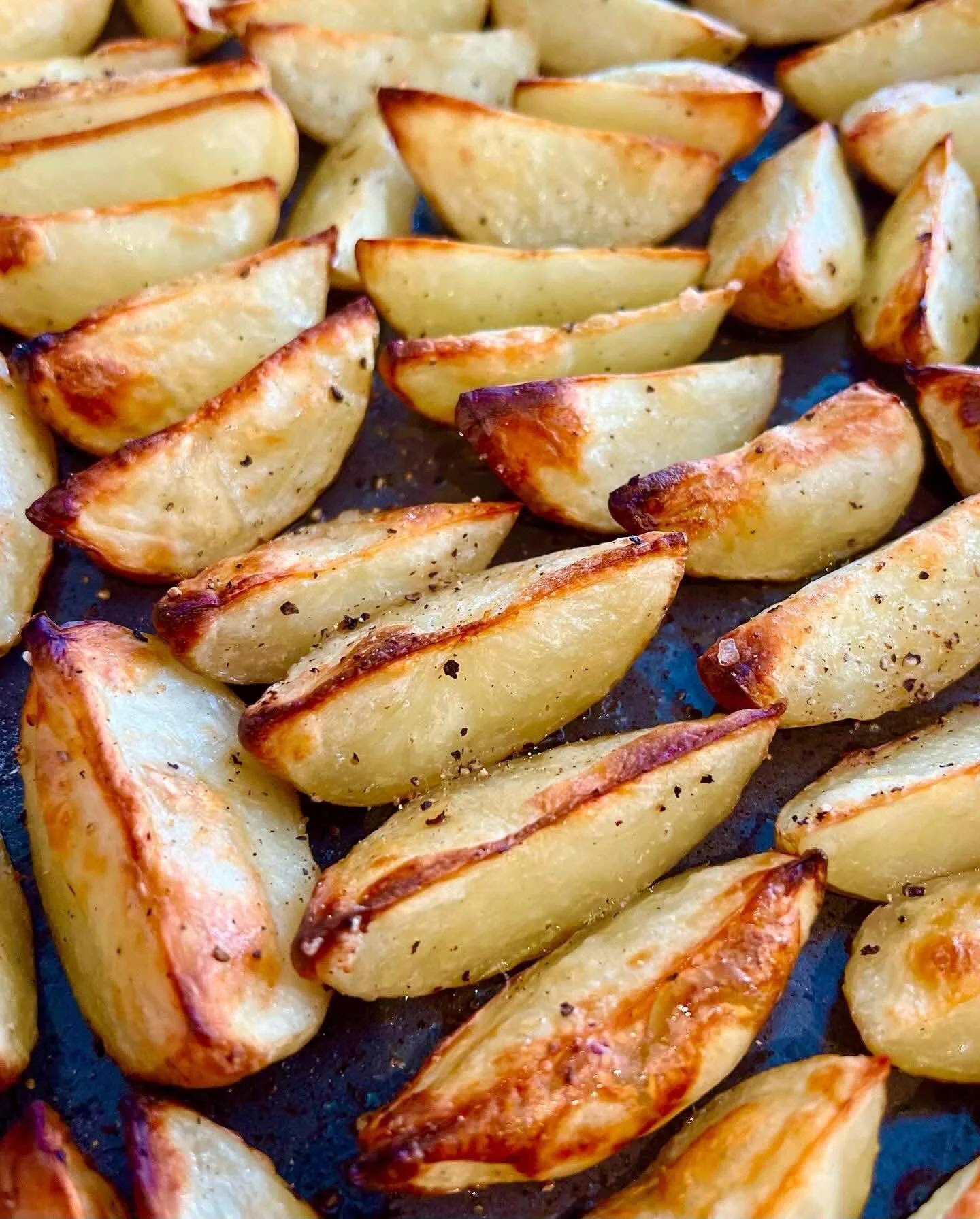Oven bake potato wedges in the oven on 180 degrees Celsius for 45 minutes, covered in olive oil and generously seasoned with salt and freshly ground pepper.