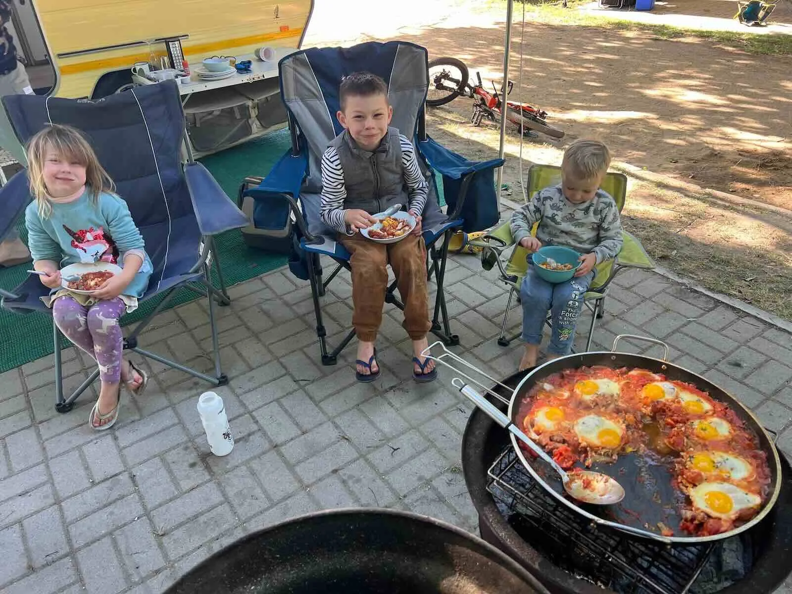 Whenever we go away for the weekend as a family, I always make a big pan of shakshuka to share. It is easy to make in a large volume and so perfect to cook for a larger group of people. While it takes a bit of time to prepare, there’s no better way to start the morning than with a fire.